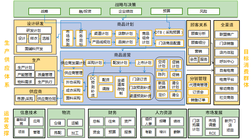 afadf后综上,服装行业对信息化的需求是一个非常复杂的综合系统,包含产品生命周期管理(PLM)、线下销售终端(POS)、线上零售终端(B2C)、零售解决方案(Retail)、服装行业解决方案(AFS)、生产执行(MES)、供应商关系管理(SRM)、立体仓库管理(WMS)、客户关系管理(CRM)、移动应用(Mobility)、大数据分析(BI)等不同方面的信息化组成部分。