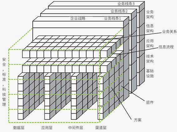 企业信息化总体架构主要涵盖企业业务架构、企业信息架构企业应用架构、企业网络基础设施架构、企业信息安全架构、企业信息组织架构等,为信息化建设的实施提供一副完整的蓝图,全面系统地指导企业信息化建设的进程。架构由3个框架元素组成:架构、方法论、工具。